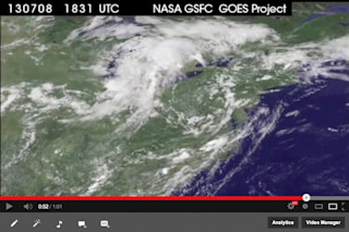 Click on this screenshot to watch an animation of GOES-13 satellite images showing storms developing and then enveloping Toronto on July 8th. The torrential downpours broke records in the city and resulted in massive flooding. (Source animation: GOES Project Science/NASA & NOAA.) In my earlier post about Monday's Toronto deluge, I mentioned that I would continue to look for remote sensing imagery of the storms that inundated the city. Click on the screenshot above for what I've come up with so far — an animation of GOES-13 images that I've uploaded to Youtube. I started with the eastern view of the GOES-13 satellite for a time period spanning the event. (You can find the most recent GOES images and animations here.) Then I did some cropping of the animation to emphasize what happened over Toronto. Lastly, I added some explanatory text at the beginning. In the video, look for a line of clouds beginning to build in the upper left quadrant of the frame, west of Lake Michigan. Those clouds then move east, blossoming at some points, covering Lake Huron, and then approaching Lake Ontario from the north and west. At about 18:00 hours UTC (look for the time stamp at the top of the video frame), the clouds seem to begin breaking like a wave over the lake, including the city of Toronto on its shore. By 20:00 UTC, or 4 p.m. local time, torrential downpours are battering the city. The rest is history.