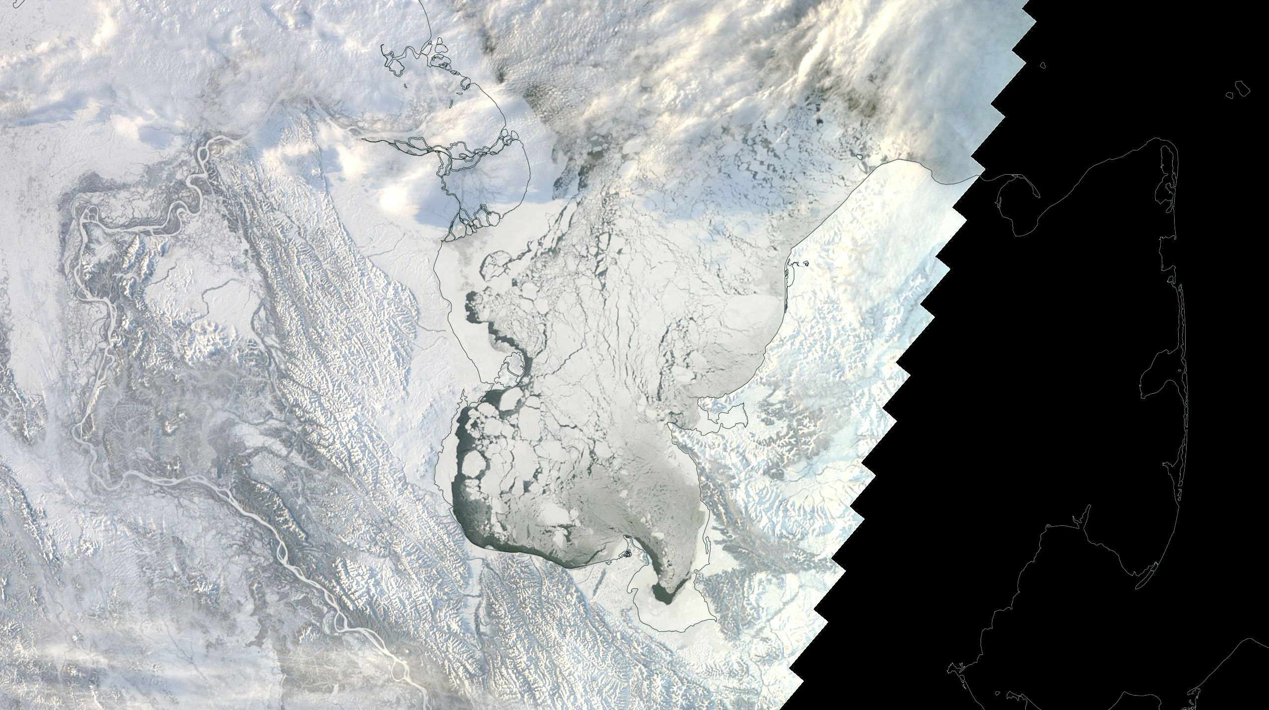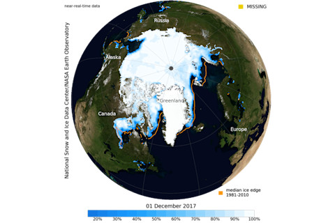 Alaska's Norton Sound on the Bering Sea is seen in this animation of images from NASA's Terra satellite. One image, acquired on Nov. 25, 2009, shows fractured sea ice filling the sound. The other, acquired on the same date this year, shows mostly open water. (The dark area to the right was not imaged by the satellite because of the polar night. Images: NASA Worldview. Animation: Tom Yulsman) With winter descending on the Arctic, sea ice should be expanding rapidly in the Bering and Chukchi seas off Alaska and eastern Siberia. But instead of sea ice, satellite sensors see thousands of square miles of open water stretching between the Alaska and Russia. "It’s the lowest ice extent on record for this time of year for the combined basins," according to Rebecca Lindsey of the National Oceanic and Atmospheric Administration. I created the animation above using images from NASA's Terra satellite to help show what's happening in the region. The images are centered on Alaska's Norton Sound, an inlet of the Bering Sea. In the image, north is toward the lower right corner. The black area, by the way, is where polar night has already fallen. With no sunlight to illuminate the scene, the satellite could not image the ground. The river delta toward the top and just left of center is the Yukon–Kuskokwim Delta. To give you a sense of scale, it is about 50,000 square miles in size, making it almost as large as Iowa. In the 2009 image, captured on Nov. 25th, Norton Sound is choked with fractured sea ice. In the one acquired on the same day this year, some ice is beginning to form along the shores. But mostly, all we can see is open water. (Make sure to click on the animation to open it, and then click on it again to zoom in.)