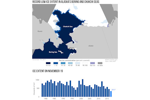 Source: NOAA Here's a map of the sea ice concentration in the Bering and Chukchi seas on Nov. 19th, along with a bar graph illustrating how conditions now compare to every other year since 1978, the year modern satellite monitoring began. "Certainly we've never seen anything quite like this before," said Mark Serreze, the director of the National Snow and Ice Data Center, quoted by Sabrina Shankman in a story for Inside Climate News. This past summer, unusually warm water streamed north from the Pacific toward the Bering Strait between Russia and the United States, helping to melt out sea ice earlier than usual. As a result, areas that would have remained covered with reflective sea ice were open for much longer than otherwise would have been the case. And the relatively dark surface of the sea was able to absorb a lot of energy from the sun. This fall, that banked solar heat is preventing sea ice from forming in the region. At the same time, strong storms have helped break up any sea ice that has managed to form. And as Shankman describes it in her piece, there is little hope for recovery any time soon. That's because the storminess is expected to continue for awhile. The lack of sea ice and the storminess have had significant impacts on local people living along the shores of the Bering Sea in Alaska. Check out Shankman's story for details on that. (See above for the link.)