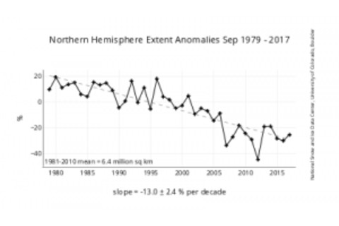 Source: NSIDC The Arctic has a long winter ahead of it. It's anyone's guess how much ice will accumulate, and then how much will melt out in summer. Last March, when sea ice reached its maximum winter extent, scientists were shocked at how little had formed. Yet the ice bounced back to a somewhat surprising extent. While Arctic sea ice extent does bounce around a bit from year to year, the overall trend couldn't be clearer — as the graph above shows. It charts extent over time during September. Scientists unequivocally say this is a result of human-caused warming of the planet — which is occurring faster in the Arctic than anywhere else on Earth.