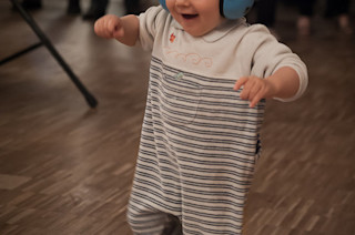 Precursors of Dancing and Singing to Music in Three- to Four-Months-Old Infants "Dancing and singing to music involve auditory-motor coordination and have been essential to our human culture since ancient times. Although scholars have been trying to understand the evolutionary and developmental origin of music, early human developmental manifestations of auditory-motor interactions in music have not been fully investigated. Here we report limb movements and vocalizations in three- to four-months-old infants while they listened to music and were in silence. In the group analysis, we found no significant increase in the amount of movement or in the relative power spectrum density around the musical tempo in the music condition compared to the silent condition. Intriguingly, however, there were two infants who demonstrated striking increases in the rhythmic movements via kicking or arm-waving around the musical tempo during listening to music. Monte-Carlo statistics with phase-randomized surrogate data revealed that the limb movements of these individuals were significantly synchronized to the musical beat. Moreover, we found a clear increase in the formant variability of vocalizations in the group during music perception. These results suggest that infants at this age are already primed with their bodies to interact with music via limb movements and vocalizations." Bonus videos from the full text: