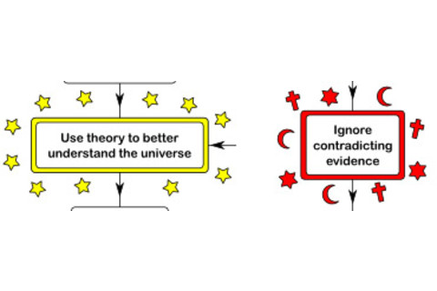 I know, a lot of people think I come across as a general religion basher, but I don't think that's entirely fair. I restrict my polemics to fundamentalist religions, the ones that are so mired their own infallibility that they cannot see when the entire Universe is proving them wrong (cough cough creationism cough cough) -- and even then, generally only when they step on the toes of science (aka reality). It's blind faith I have a problem with. So that's why I love this Wellington Grey cartoon of a flowchart depicting science versus faith: