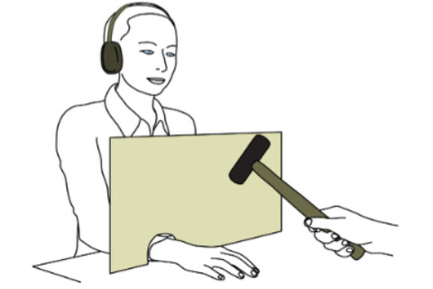 No matter how much of a critical thinker you consider yourself, your brain is pretty gullible. With a few minutes and a couple of props, your brain can be convinced that one of your limbs is made of rubber or invisible, or that your whole body is the size of a Barbie doll's. All these illusions depend on your senses of vision and touch interacting. But a new illusion trades sight for sound. By hearing the sound of a hammer striking marble each time it tapped their hands, subjects came to feel that their limbs were made of stone. In the original rubber hand illusion, first published in 1998 by psychologists Matthew Botvinick and Jonathan Cohen, subjects sit with one forearm resting on a table. A little wall blocks the subject's own arm from his or her sight, while a rubber arm just inside the wall is clearly visible. A researcher sitting on the opposite side of the table simultaneously strokes the backs of the rubber hand and the real hand with paintbrushes. As subjects watch the paintbrush stroking the rubber hand and feel the action on their own skin at the same time, they come to feel a powerful illusion that the rubber hand is their hand. Scientists have since performed many variations of this experiment, bending people's perceptions of their own bodies in all kinds of freaky ways. (See below for links to stories about a few of those studies.) "The focus of those experiments is embodiment," says Irene Senna, a psychologist at Milano-Bicocca University in Milan, Italy. "Can our body incorporate an external body part?" The findings are relevant to amputees and people learning to use artificial limbs. But Senna and her coauthors were interested in a slightly different question: instead of convincing ourselves that an inanimate hand is our own, can we come to believe that one of our existing body parts is made of a non-human material? This being Italy, the material the researchers chose wasn't novelty-shop rubber, but stately marble. To create the illusion, they had 23 subjects sit with one forearm on a table. A wall blocked the subject's hand from his or her view—but subjects were able to see the small hammer an experimenter swung toward the hand repeatedly. A piece of metal foil tape on the back of each subject's hand was connected by a wire to the hammer, and to a computer. Whenever the hammer touched the foil, it triggered the desired sound effect: the chink! of hammer striking marble.