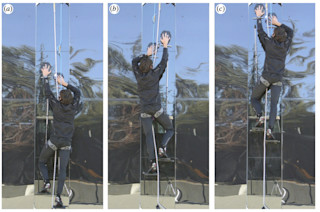 Three frames from a video (below) showing a 70 kg climber ascending a 3.7 m vertical glass surface using a synthetic adhesion system with degressive load-sharing and gecko-inspired adhesives.Even though I still really want a jetpack, I'm pretty stoked about this new technology developed by scientists at Stanford University. Inspired by the incredible climbing ability of geckos, they developed a synthetic material that allows full-grown adults to scale glass skyscrapers, just like Spiderman! Be sure to check out the awesome video below!Human climbing with efficiently scaled gecko-inspired dry adhesives. "Since the discovery of the mechanism of adhesion in geckos, many synthetic dry adhesives have been developed with desirable gecko-like properties such as reusability, directionality, self-cleaning ability, rough surface adhesion and high adhesive stress. However, fully exploiting these adhesives in practical applications at different length scales requires efficient scaling (i.e. with little loss in adhesion as area grows). Just as natural gecko adhesives have been used as a benchmark for synthetic materials, so can gecko adhesion systems provide a baseline for scaling efficiency. In the tokay gecko (Gekko gecko), a scaling power law has been reported relating the maximum shear stress σmax to the area A: σmax ∝ A(-1/4). We present a mechanical concept which improves upon the gecko's non-uniform load-sharing and results in a nearly even load distribution over multiple patches of gecko-inspired adhesive. We created a synthetic adhesion system incorporating this concept which shows efficient scaling across four orders of magnitude of area, yielding an improved scaling power law: σmax ∝ A(-1/50). Furthermore, we found that the synthetic adhesion system does not fail catastrophically when a simulated failure is induced on a portion of the adhesive. In a practical demonstration, the synthetic adhesion system enabled a 70 kg human to climb vertical glass with 140 cm(2) of adhesive per hand."