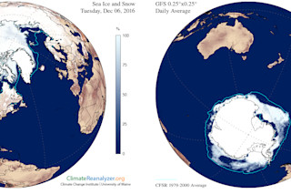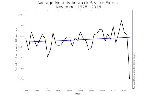 Monthly November Antarctic sea ice extent for 1979 to 2016. (Source: National Snow and Ice Data Center) With some obvious ups and downs, ice extent around Antarctica had been growing slowly since 1979. But look at that plunging line showing what happened in November. I can't think of any word to describe this other than shocking. Temperatures were 4 to 7 degrees Fahrenheit higher than normal around much of Antarctica during November, according to the NSIDC. In addition, winds circling the Antarctic continent shifted rapidly, bringing winds from the north. These compressed areas of low-concentration sea ice, reducing the overall extent. "The Arctic has typically been where the most interest lies, but this month, the Antarctic has flipped the script and it is southern sea ice that is surprising us," says Walt Meier.