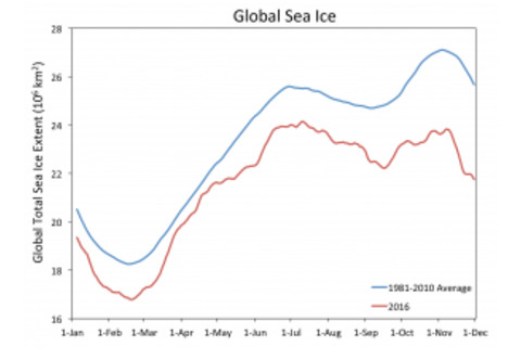 Daily extent of Arctic sea ice in 2016, and every other year since 1979. (Source: NASA Earth Observatory) The animation above illustrates the long-term decline in Arctic sea since the start of the satellite observation era in 1979. It also dramatizes just how much sea ice extent has plunged in both October and November of this year. Meanwhile, in the Southern Hemisphere, a rapid and dramatic decline in sea ice extent occurred in November, as this graph illustrates: