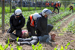 Protesters and police clash in May 2011, in a Belgian field where Ghent University and BASF planted genetically modified crops. Gianni Barbieux/Reporters/Redux