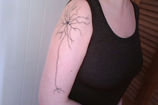 Sandra writes, "My tattoo is an intrinsically photosensitive retinal ganglion cell, my favourite type of neuron. Only discovered a few years ago, it detects light without vision and communicates directly to a part of the brain (the suprachiasmatic nucleus) that helps control circadian rhythms."