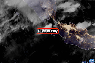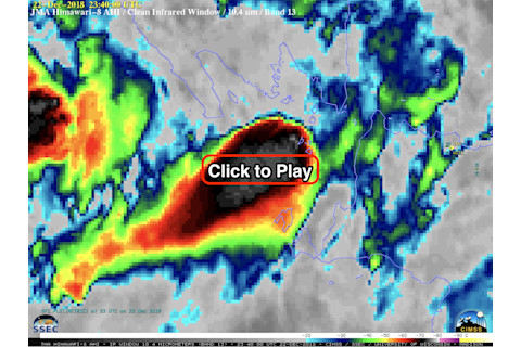 A volcanic cloud from the eruption of Anak Krakatau in Indonesia on December 22, 2018 is seen in this animation of satellite images acquired by the Himawari-8 satellite. Two distinct volcanic pulses are evident. (After clicking on the screenshot above, click "play" in the upper left corner of the page that launches. If the animation does not run, refresh the page. Source: RAMMB/CIRA SLIDER) In Indonesia, they call it "Anak Krakatoa, meaning "child of Krakatoa." It's a volcano that rose from the sea in the 1920s decades after one of the most deadly volcanic cataclysms in recorded history killed tens of thousands of people and all but obliterated the island of Krakatoa, between Java and Sumatra. Now, Anak Krakatau has itself brought great misery to Indonesia, with an eruption that apparently triggered an underwater landslide, which in turn sent a tsunami racing toward the western tip of the island of Java. A wall of water roared ashore, catching residents and vacationers completely unawares. As I'm writing this on Christmas Eve, more than 370 people have perished, and more than a hundred still are missing. When Anak Krakatau erupted on December 22, Japan's Himawari-8 weather satellite was watching from geostationary orbit, 22,239 miles overhead. Click on the screenshot above to watch what the satellite saw. The animation consists of "GeoColor" imagery acquired in different parts of the electromagnetic spectrum at 10-minute intervals starting at 11:00 UTC. A first pulse of ash is visible at about 13:40, and then a second one at 15:20. As the animation continues, dawn breaks and a plume of ash and steam can still be seen amidst a cloudy atmosphere. Here's what the eruption looked like in the infrared part of the electromagnetic spectrum: