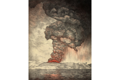 Clouds pour from the Krakatoa volcano during May of 1883, as depicted in a lithograph originally published in 1888 by a Royal Society Report on the eruption. This was an early stage in an event that led to one of the most devastating volcanic cataclysms on record. (Source: Wikimedia Commons) Death and destruction from volcanic eruptions are nothing new in this part of the world. In fact, Krakatoa — Anak Krakatau's 'parent' — exploded far more massively in August of 1883. The explosion, following more than a month of activity, rocketed billions of tons of pumice up to 50 miles into the sky; ten days later, dust fell 3,000 miles away. The explosion also caused the entire 2,600-foot-high volcanic cone to collapse, obliterating most of the island and triggering tsunami waves that towered up to 130 feet high. An estimated 36,000 people perished, swallowed up by the mountains of onrushing water.