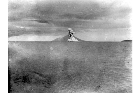 Anak Krakatau, or "Child of Krakatoa," spews ash during the 1920s. The volcano rose up after Krakatoa island was destroyed following the massive eruption in 1883. (Source: Tropenmuseum, via Wikimedia Commons) It took more than 40 years for Anak Krakatau to rise up from the undersea remains of Krakatoa. You can see it erupting in 1928 in the photograph above.