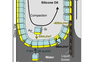 To get around this problem, the researchers designed a kind of conveyor belt. They made a solar cell substrate with regular depressions lined with low-temperature solder, which were designed to receive the individual solar cell elements. Each element had gold on one side and silicon on the other. The silicon side was painted with a hydrophobic molecule that is repelled by water, and was painted the gold side with a hydrophilic, or "water-loving," molecule. When the elements were dumped into a vial containing oil and water, the elements neatly lined up in a row at the boundary between the two liquids. Each element had its gold side pointed towards the water. In the study, published in the Proceedings of the National Academy of Sciences, the researchers describe how the solar cell took over the work from there.