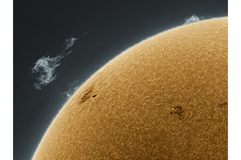 Holy wow! Click to ensolarnate. And I mean it: you want to see the bigger version of this. This picture was taken by Alan Friedman, who is no stranger to this blog: his picture of the boiling Sun last year was hugely popular, and so amazing I featured it as one of my top pictures of 2010. And with this he's done it again... and maybe even topped it. Alan used a filter that lets through only a very narrow wavelength of light emitted by hydrogen (called Hα for those of you keeping track at home), so this tracks the activity of gas on the solar surface. He also inverts the image of the solar disk (makes it a negative) to increase contrast. Somehow this adds a three-dimensional quality to the picture, and reveals an amazing amount of texture. I swear I had a rug in my bedroom growing up that was this texture (though somewhat cooler and less burny). The scene-stealer is that detached prominence off to the left. That's the leftover material ejected from the Sun by an erupting sunspot (you can see other sunspots in the picture as well). The gas is ionized -- a plasma -- and so it's affected by magnetic fields. The material follows the magnetic field of the Sun in the explosion, lifting it off the surface and into space. Sometimes it falls back, and sometimes it leaves the Sun entirely. In this case, Alan caught some of the material at what looks like the top of its trajectory. The beauty of this picture belies its violence and sheer magnitude: the mass of material in a prominence can easily top