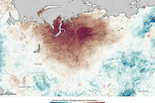 The map above shows how temperatures departed from the long-term average in Siberia July 20-27, 2013. (Image: NASA Earth Observatory) Last Sunday I posted a story about fires blazing in Siberia, which had been baking in near-record temperatures for over a week. Now, NASA's Earth Observatory has produced this map with an accompanying piece documenting just how hot temperatures have been in the region. The reddest colors indicate where high temperatures were more than 15 degrees C warmer than the long term average between July 20 and 27. The northern city of Norilsk is in one of those red areas. Daily high July temperatures there typically average 16 degrees C (61 degrees F). But during that week they soared to 32 degrees C (90F). Norilsk, among other places, is not expected to see much relief for awhile. Highs in the upper 80s and low 90s are forecast for the weekend. And much warmer than normal temperatures are forecast for all of next week. (You can check the weather in Norilsk here.) By blocking weather systems that would bring rain and cooler temperatures, a persistent high pressure system is the proximate cause of the high temperatures, according to NASA. But by making high temperatures even higher than they otherwise would be, human-caused global warming also plays a role. The result: