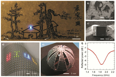 To demonstrate their pen-and-paper approach, the researchers drew a copy of a Chinese landscape painting with the pen and affixed an LED to the peak of a house's roof. Once the silver lines were connected to a battery at the edge of the page, the LED lit up. And by drawing interconnections between LEDs arranged in a grid on a sheet of paper and hooking them up to a battery, they created several glowing block letters. They even built a 3D antenna by drawing lines on a piece of sticky-backed printer paper that they folded around a glass ball. For anyone looking for a cheap way to built circuits without a printer or any custom equipment, this seems like quite the find. And if you're looking to relive the 90s, well, it's good for that too.