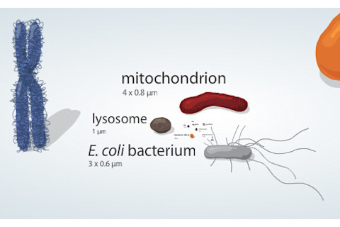 The folks at the Genetic Science Learning Center at the University of Utah have a nifty little interactive gizmo on their web page which shows the relative sizes of small objects from a coffee bean down to a carbon atom. A slider along the bottom (or just running your mouse left/right on the graphic itself) changes the scale, so zoom in and out on the objects. You fly past a mitochondrion, E. coli, all the way down to a carbon atom. The sizes are given too.