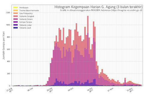 Earthquakes at Agung in Indonesia over the past few months. PVMBG. Reports from Bali say that everyone is calm right now, as they should be. There are still over 30,000 people in shelters from the evacuation orders given during September. The BNPB (Indonesia's disaster agency) continues to maintain a 7.5-km exclusion radius around the volcano and this eruption was clearly small enough that no one is in immediate danger. The PVMBG hasn't raised the alert status