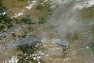 Thick smoke from wildfires burning to the west blankets parts of Montana, as seen in this image captured by NASA's Terra satellite. (Source: NASA Worldview) Nationally, 39 large fires are burning in nine states from Alaska to Arizona. Collectively, they've burned more than three quarters of a million acres. Although it sounds dire — and it has been for individual communities that have been affected — the wildfire activity is about average for this time of year, according to the National Interagency Fire Center. Even so, that's a lot of fire. And smoke. I've noticed the latter here on the eastern slope of the Rockies near Boulder — a thin scrim of haze that has turned the sunlight much more golden than we're used to in Colorado. And given the image from NASA's Terra satellite at the top of this post, people in of Montana, particularly the northeast portion of the state, were really noticing the smoke yesterday. That almost greenish looking stuff criss-crossed in places by straight lines is smoke. To make sure, I checked the aerosol optical depth readings from the MODIS instrument on Terra, which give an indication of the presence of smoke particles in the air. There were a lot. (You can see what I found here.) But what about those criss-crossing lines? I am guessing that they are aircraft contrails.