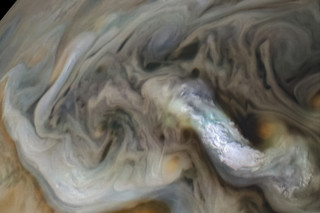 Looking a bit like earthly thunderheads, a white band of high-altitude clouds emerge above the colorful, swirling patterns of Jupiter in a photo taken last summer by NASA’s Juno spacecraft. Jupiter, the solar system’s largest planet, has no Earth-like surface. Instead of an outer crust, the gas giant consists mainly of hydrogen and helium that condenses into liquid the deeper you go, all wrapped in an atmosphere of clouds made up of ammonia ice, ammonium hydrosulfide crystals and ice water vapor.