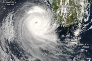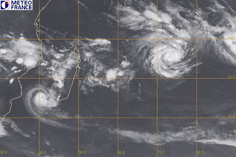 Click here or here for the high resolution version of this NASA graphic. Meanwhile, here's a pic from Meteo France with a much broader view of the South Indian basin, showing both Favio as well as another potential cyclone forming closer to Diego Garcia....