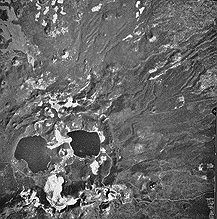 High altitude image of Newberry Caldera, showing the Paulina and East Lakes in the caldera and the apron of pyroclastic deposits and basaltic lava flows surrounding the caldera.