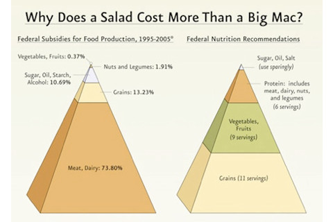 I'm not usually impressed by these kinds of comparisons; if the Iraq war really had inspired populaces throughout the entire Middle East to spontaneously overthrow their despotic governments and inaugurate a new era of democracy, tolerance, and prosperity, it would have been a good idea. The war is expensive, but that's not the best argument against it. Still, the occasional pictorial representation of our spending priorities does help to bring home how messed up they are. Via Ezra Klein, here's the famous food pyramid, along with a corresponding pyramid showing how we subsidize different types of production.