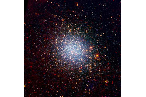 Spitzer Space Telescope caught this image of the cluster Omega Centauri, which I recently wrote about. Whether Omega Cen is a galaxy or a globular cluster doesn't change the fact that this is a striking image. It's actually a combo of Spitzer and ground-based images taken with a 4-meter telescope in Chile. Stars shown here as blue (more on that in a sec) are low-mass stars seen in both the 4-meter 'scope and Spitzer. Yellow and red stars were seen only by Spitzer. Since it looks in the infrared, that means these stars are probably more evolved. Why? Clusters (or galaxies) like Omega Cen form pretty much all at once, using up all their gas to make stars. Since high-mass stars age more rapidly, and clusters like this are old, all the more massive stars have already either blown up (if they were massive enough) leaving behind black holes or neutron stars, or have long since turned into red giants and blown off their outer layers. That leaves behind a very faint white dwarf. Omega Cen is very old, so only lower mass stars are still around, but even they have evolved into red giants. Those stars tend to emit more light in the infrared, both due to their low temperature as well as blowing off lots of dust, which enshrouds them and reddens their light. In fact, these images were taken to investigate how much dust these stars are generating. Fewer dusty stars were found than expected, which is interesting. Clusters like this tend to have lower metals (the term astronomers use for anything on the periodic table heavier than helium) because they formed early in the Universe, before massive stars could make those heavy elements and seed them into space. Could this lack of metals affect the dust formation? Images like this one can lead us to those answers. By the way, in Omega Cen the lowest mass stars are still going strong. Ironically, in this false-color image, those stars are colored blue (meaning visible light), but if you looked at them with your eye they'd look orange or red. False color images can be tricky, and in this case things are really topsy-turvy. But it sure is a pretty picture.