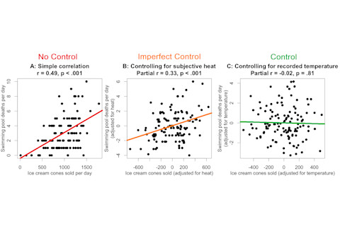 Now, no matter how strong this correlation is, it doesn't really mean that ice cream is dangerous. Rather, the association exists because of a 'confound' variable. In this case it's temperature: on sunny days, people tend to eat more ice cream and they also tend to go swimming more often, thus risking drowning. The ice cream/drownings correlation would cease to exist once you take temperature into account. This means that ice cream has no 'incremental validity' over temperature: it doesn't add anything to our ability to predict downing, above what we can predict from temperature. Controlling for confounds is a widely-used technique in science. However, accordng to researchers Jake Westfall and Tal Yarkoni, there's a major pitfall associated with the method. In a new paper, they warn that Statistically Controlling for Confounding Constructs Is Harder than You Think Their argument is a simple one but the implications are rather serious: if you want to control for a certain variable, let's call it C, your ability to succesfully correct for it is limited by the reliability of your measure of C. Let's call your experimental measure (or construct) Cm. If you find that a certain correlation holds true even controling for Cm, this might be because C is not really a confound, but it might also be that Cm is a poor measure of C. "Controlling for Cm" is not the same as "Controlling for C". Staying with the ice cream/drowning example, for instance, suppose that we had a broken thermometer, meaning that our measure of temperature was noisy. Ice cream sales might well predict drownings even after controlling for our flawed 'temperature' variable. We might, then, conclude that ice cream and drownings have some deep connection beyond temperature. Here's Westfall and Yarkoni's illustration of the problem. On the left we see the original icecream-drowning correlation, on the right the zero correlation after correcting for C, temperature. In the middle we see that the correlation remains (albeit smaller) with some hypothetical imperfect measure of temperature, Cm.