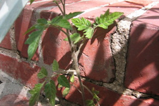 Time for a gardening picture, methinks. Well, this is so odd I thought I'd share. A while ago I spotted a weed growing out of the steps out at the front of the house. This happens a lot, which is fine. What does not often happen (in fact, it has never happened before) is that I reached to pull it out and noticed that it is an unusual weed, but familiar-looking. I touched it, and immediately could detect a distincitve smell - it is a tomato plant. A tomato plant! Well, of course, I could not bear to do anything to it, and left it there thinking it would eventually run its course and die. Well, I had a look the other day and it is getting really big and healthy! Thing is, I've no idea how it got there. I've never had tomato plants or seeds out at the front. How come it just started growing there spontaneously? Bizarre. You're welcome to make up your own explanations at this point. I can't think of a plausible one. Since it continues to do so well, I decided I would transplant it to the back garden where I actually do have tomato plants, but now it is stuck in the steps, and I cannot pull it up. It is well and truly stuck. Surely it can't grow any more without damaging its stem.... I've no idea what is going to happen. -cvj