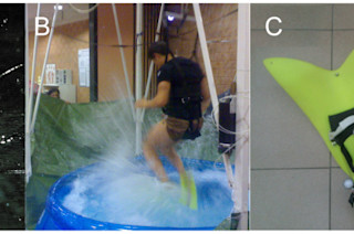 Figure 1. Running on water in Basilisk lizard (A, Basiliscus basiliscus), and human in our laboratory conditions (B). The fins used are illustrated in C.These three Italian scientists deserve a prize for the most superhero-inspired experiment: they first used mathematical modeling to predict that humans would be able to walk on water in reduced gravity, and then they actually tested it with special flipper shoes and a kiddie pool! As they note in their introduction, "Notwithstanding various internet hoaxes, humans are apparently incapable of walking or running on water." (Never have I wished so much for a citation as at the end of that sentence... please amend this oversight in the comments!) And boy, do I wish my Ph.D. dissertation was half as fun as the experiments in the video below. Seriously--if you need someone to go on a lunar mission to splash across a kiddie pool in order to test this hypothesis more rigorously, sign me up!Humans Running in Place on Water at Simulated Reduced Gravity. "Background: On Earth only a few legged species, such as water strider insects, some aquatic birds and lizards, can run on water. For most other species, including humans, this is precluded by body size and proportions, lack of appropriate appendages, and limited muscle power. However, if gravity is reduced to less than Earth’s gravity, running on water should require less muscle power. Here we use a hydrodynamic model to predict the gravity levels at which humans should be able to run on water. We test these predictions in the laboratory using a reduced gravity simulator. Methodology/Principal Findings: We adapted a model equation, previously used by Glasheen and McMahon to explain the dynamics of Basilisk lizard, to predict the body mass, stride frequency and gravity necessary for a person to run on water. Progressive body-weight unloading of a person running in place on a wading pool confirmed the theoretical predictions that a person could run on water, at lunar (or lower) gravity levels using relatively small rigid fins. Three-dimensional motion capture of reflective markers on major joint centers showed that humans, similarly to the Basilisk Lizard and to the Western Grebe, keep the head-trunk segment at a nearly constant height, despite the high stride frequency and the intensive locomotor effort. Trunk stabilization at a nearly constant height differentiates running on water from other, more usual human gaits. Conclusions/Significance: The results showed that a hydrodynamic model of lizards running on water can also be applied to humans, despite the enormous difference in body size and morphology." Related content: NCBI ROFL: Bats eavesdrop on the sound of copulating flies. NCBI ROFL: Scientific proof that milk is better on cereal than water. NCBI ROFL: Horrified hot tub is horrified.