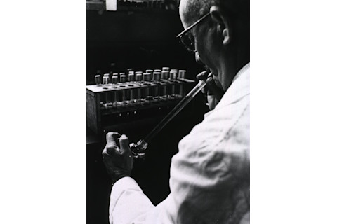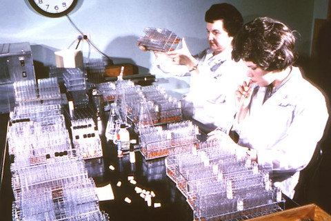 Former Centers for Disease Control (CDC) parasitologist, Dr. Mae Melvin (Lt), examines a collection of test tubes while her laboratory assistant mouth pipettes a culture to be added to these test tubes. Source: David Senser/CDC.