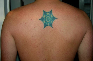 "I got mine in grad school (PhD materials science and applied physics, 2004 Cal). The tatoo is a convergent beam electron diffraction (CBED) image of 6-4 Ti alloy (hexagonal, or beta phase) one of the first 'super alloys'. Being light-weight, high-strength, and corrosion resistant, I felt it was appropriate to put on my back, to keep it strong."--Abraham