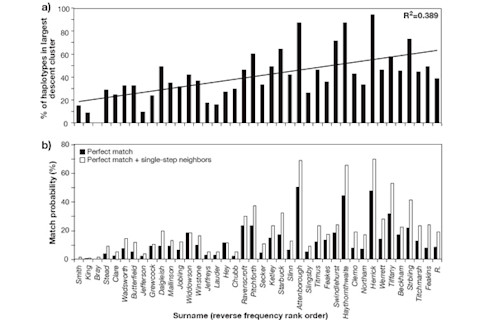Interesting points: 1) Really rare surnames share a common Y chromosomal lineage. This is a pretty good indicator of relatedness. Additionally, many of these lineages are extremely rare in the general population, reducing the likelihood of independent "non-paternity events" introducing the haplotypes. In contrast, common surnames don't seem have gene lineages any more related than the general population. 2) There are a variety of data which suggest to the authors that the high frequencies of some of these lineages is due to genetic drift filtering the diversity. The time until extinction of a given lineage is inversely proportional to effective population size. In plain English large populations are far less likely to lose information in the form of genetic diversity due to sampling variance from generation to generation. In real populations the sampling variance is due to a variety of factors, including reproductive skew (which is modeled as a poisson process). This is the same insight which scientists have had a hard time explaining to the public when it comes to "mitochondrial Eve." Just because one gene lineage comes down to the present day in a straight line through mothers does not mean that other females did not exist, and reproduce, and so contribute to the genetic diversity today. The same is true here for modal haplotypes in surname groups of rare frequency. Though the Y chromosomes are related in rare frequency surnames, I'd be curious what total genome content would tell us (uniparental lineages are subject to stronger drift because of smaller effective population sizes). Here's a figure which shows the English data well:
