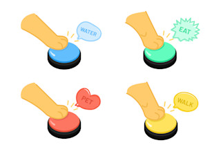 Stella, and now hundreds of dogs and cats, use augmentative and alternative communication (AAC) to “talk” with the humans in their lives. AAC takes the form of buttons affixed to a soundboard. When the pet presses a button, it plays a recording of a word, such as “hungry,” “outside,” “water,” or “play” — whatever has been recorded.
