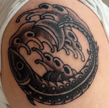As regular readers may recall, I made a bet with Hive Overmind Discover Magazine CEO Henry Donahue that if we hit a target number of page views to both the BA Blog and the DM site, we'd both get tattoos. I can't reveal mine just yet, but here is a picture of Henry's: it's a Celtic salmon, and I must say it's quite nice. I particularly like the waves over the fish. The reason I can't reveal mine is that I had it done as part of the TV show L.A. Ink, and I can't post pictures or talk about the design until after the show airs. But don't worry, I'll post the whole painful (literally) story right here once I can. Congrats to Henry for such a handsome ink job! I can't wait until we meet up again, and we can compare tats in person. That'll be a fun pic for the blog.