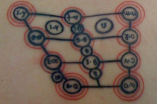 "My name is Steve Kleinedler, supervising editor for the American Heritage Dictionary, where I have worked since 1997. One of my many responsibilities is pronunciation. The tattoo is a stylized version of a phonetic vowel chart -- it shows the relative position of the tongue in the mouth when those vowel sounds are articulated. I had a smaller, simpler version done on my upper back in 1993, and I've been wanting to get the full version for quite some time. "The design is by Kyle Nelson of Stoltze Design and the tattoo artist was Mike Helz of Stingray Body Art." Click here to go to the full Science Tattoo Emporium.