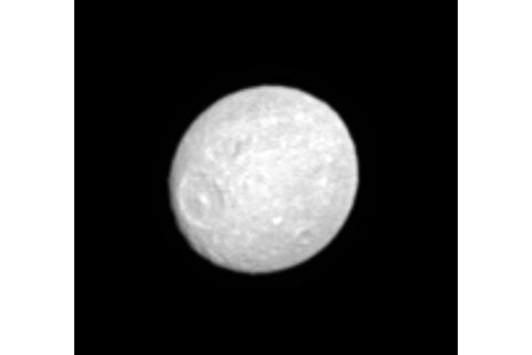 That image shows Saturn's weird moon Mimas, which is uncannily like the Death Star, floating in front of Saturn's magnificent rings. Cassini was pretty far out when it took this image; nearly twice as far from Mimas as the Earth is from the Moon. I've written about Mimas before, but while poking around the web to find out more info just now, I found out that Mimas is not even close to being a sphere! Check this out:
