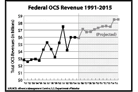 and explained our next administration will be much more promising than the current one--no matter who the victor. She emphasized the significance of monetary investment because Congress must prepare for more storms like Katrina and Rita. The senator went on to talk about finding balance between the needs of the environment with multiple human uses. She spoke about her policy to provide excess revenue to coastal states from drilling on the Outer Continental Shelf (OCS)* [and what's anticipated in the Alaska National Wildlife Refuge (ANWR)] and believes 'we can drill safely' explaining 'more oil that seeps naturally from the floor of the ocean than from the oil rigs.' (I'm not sure I completely agree on safety, but that's a topic for another post). So while Senator Landrieu never addressed my actual question on how to most effectively influence Congress toward prioritizing our issues, she succeeded in making a strong case for government support of science and technology and demonstrated an informed understanding of why increased funding is so critical. I want to praise her for her willingness to be engaged with the science community and taking time out of a very busy schedule to speak with us and answer questions. Senator Landrieu showed real environmental leadership yesterday and I left satisfied and impressed. * [It's worth pointing out that my old boss, Senator Nelson (D-Fl), has worked consistently to 'keep offshore drilling away from Florida's coast in order to protect the state's tourism-driven economy, its unique environment and the country's vital military testing and training areas in the Gulf of Mexico.' When I was there in 2006, he blocked Senate OCS drilling legislation until it provided adequate protections for the state.] A chart of Landrieu's projected OCS revenue through 2015 after the jump...