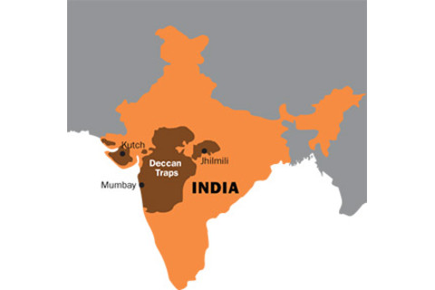 Some researchers have never been cool, or at least completely cool, with the Chicxulub impact theory. They've looked instead to a different scar on the planet, one on the other side of the world. On the Indian subcontinent, the sprawling Deccan Traps are today, thanks to plate tectonics, all that remains of a massive volcanic event. How massive? So glad you asked. It lasted a million years, give or take, and piled up lava about 6,500 feet thick across an area the size of the Pacific Northwest.