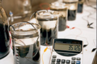 In the laboratory, it was a relatively simple step for Lovley to dupe the enterprising microbes into passing their electron booty to an even more attractive mineral—an electrode made of unpolished graphite. Immersed in a small tank of sugar water, the microbes settled on the electrode and got busy, extracting electrons from the sugar and dropping them directly on the electrode, which fed an external circuit: Voilà, electricity. R. ferrireducens is highly efficient, passing a full 80 percent of the available electrons to the electrode. (Other microbes turn over less than 50 percent.)