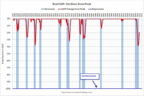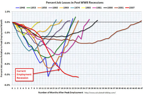 Two interesting graphs from Calculated Risk. The first shows that the changes in GDP seem during the last recessive are on a par with those of the early 1980s and before (though we don't know if we're in a U or V shaped recession yet, though the odds are probably more U than V right now). But the second shows that in terms of employment we may be in uncharted territory, the worst of both worlds in terms of the jobless recoveries of the shallow recessions of the 1990s and early 2000s as well as the deep declines in employment of earlier recessions. I've been hearing about the soon-to-come structural realignments in the economy resulting in a higher basal rate of unemployment for nearly 20 years. Economists will of course scoff at this sort of fatalism, pointing out such prognostications have always been falsified in the past. We'll see....