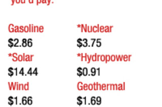 With the price per barrel of crude oil at a formerly panic-inducing $90, and at the pump, the price in many areas is no longer just flirting with $3 a gallon. Imagine a world without gas-guzzling combustion engines (it’s easy if you try), where much of our technology isn’t dependent on oil. We could then look objectively at how much each unit of energy—usually measured in Btu—costs and judge which energy sources make the most economic sense. Granted, a nuclear-powered car is not a likely alternative, but if it were possible to get other energy sources at the current taxed or subsidized cost into the gas tank, here’s how the costs would compare.