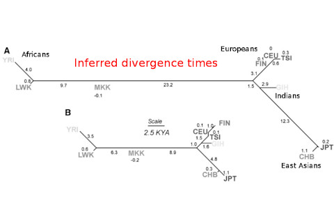 Last summer I made a thoughtless and silly error in relation to a model of human population history when asked by a reader the question: "which population is most distantly related to Africans?" I contended that all non-African populations are equally distant. This is obviously wrong on the face of it if you look at any genetic distance measures. West Eurasians, even those without recent Sub-Saharan African admixture (e.g., North Europeans) are closer than East Eurasians, who are often closer than Oceanians and Amerindians. One explanation I offered is that these latter groups were subject to greater genetic drift through a series of population bottlenecks. In this framework the number of generations until the last common ancestor with Sub-Saharan Africans for all groups outside of Africa should be about the same, but due to evolutionary factors such as more extreme genetic drift or different selective pressures some non-African groups had diverged more from Africans than others in terms of their genetic state. In other words, the most genetically divergent groups in relation to Africans did not diverge any earlier, but simply diverged more rapidly. Dienekes Pontikos disagreed with such a simple explanation. He argued that admixture or gene flow between Africans and non-African groups since the last common ancestor could explain the differences. I am now of the opinion that Dienekes may have been right. My own confidence in the "serial bottleneck" hypothesis as the primary explanation for the nature of relationships of the phylogenetic tree of human populations is shaky at best. Why my errors of inference? There were two major issues at work in my misjudgments of the arc of the past and the topology of the present. In the latter instance I saw plenty of phylogenetic trees which illustrated clearly the variation in genetic distance from Africans for various non-African groups. Why didn't I internalize those visual representations? It was I think the power of the "Out of Africa" (OoA) with replacement paradigm. Even by the summer of 2010 I had come to reject it in its strong form, due to the evidence of admixture with Neanderthals, and rumors of other events which were born out to be true with the publishing of the Denisovan results. But to a first approximation the clean and simple OoA was still looming so large in my mind that I made the incorrect inference, whereby all non-Africans are viewed simply as a branch of Africans without any particular differentiation in relation to their ancestral population. Secondarily, I also was still impacted by the idea that most of the genetic variation you see in the world around us has its roots tens of thousands of years ago. By this, I mean that the phylogeographic patterns of 25,000 years in the past would map on well to the phylogeographic patterns of the present. This assumption is what drove a lot of phylogeography in the early aughts, because the chain of causation could be reversed, and inferences about the past were made from patterns of the present. My own confidence in this model had already been perturbed when I made my errors, but it still held some sort of sway in my head implicitly I believe. It is one thing to move on from old models explicitly, but another thing to remove the furniture from your cognitive basement and attic. I have moved further from my preconceptions between then and now. It took a while to sink in, but I'm getting there. A cognitive "paradigm shift" if you will. In particular I am more open to the idea of substantive back migration to Africa, as well as secondary migrations out of Africa. A new paper in Genome Research is out which adds some interesting details to this bigger discussion, and seems to weigh in further against my tentative hypothesis that serial bottlenecks and genetic drift can explain variation in distance to Africans of various non-African groups. Human population dispersal “Out of Africa” estimated from linkage disequilibrium and allele frequencies of SNPs: