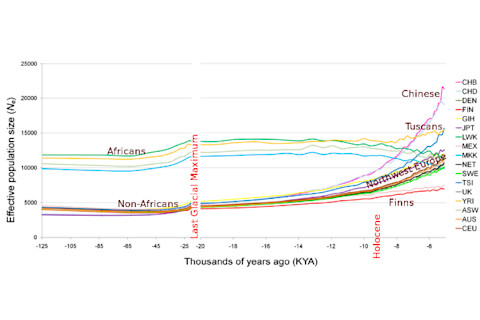 ...likely the consequence of bottlenecks associated with the depopulation and recolonization of Northern Europe before and after the last glacial maximum...growth accelerates moving forward in time, with the average rate about threefold higher in the period 8–5 KYA than 20–8 KYA, presumably representing the impact of agricultural innovations on population density.