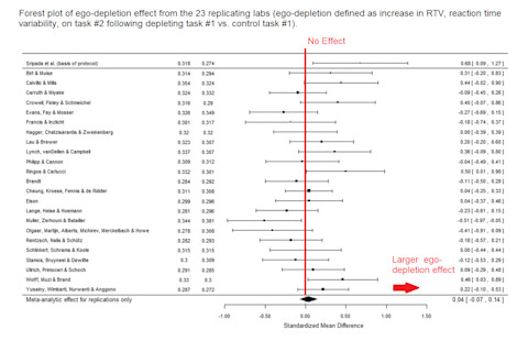 It's not been a good month for the theory of ego-depletion - the idea that self-control is a limited resource that can be depleted by overuse. Two weeks ago, researchers reported evidence of bias in the published literature examining the question of whether glucose can reverse ego-depletion. Now, the very existence of the ego-depletion phenomenon has been questioned by an international collaboration of psychologists who conducted a preregistered replication attempt (RRR). The results have just been published in Perspectives on Psychological Science (although they've been circulating for a while.) 23 labs participated in the replication effort, with a total final sample size of 2,141 participants. The project was co-ordinated on the Open Science Framework (OSF) and the paper was written by Martin Hagger and Nikos Chatzisarantis. Methodologically, the replicators did not attempt to reproduce the original version of the ego-depletion task, saying that "the tasks used in the original experiments were deemed too elaborate or complex to be appropriate for a multilab replication." Instead they focussed on the procedures used by a recent paper, Sripada et al. (2014), which were fully computer-administered, and thus more portable. Importantly, Hagger and Chatzisarantis say that "The decision to use these tasks was based on the recommendation of Roy Baumeister"; Baumeister being the man who introduced the concept of ego-depletion back in 1998... but see below. When asked to predict the outcome of the experiment, only one lab predicted a null result. The other 22 predicted seeing at least a small effect, perhaps because there have been dozens of published studies reporting positive evidence of ego-depletion. Contrary to expectations, the replication gave a null result: there was no statistically significant ego-depletion effect, combined across all labs (Cohen's d = 0.04, 95% CI [−0.07, 0.15]). In two out of the 23 labs, a significant ego depletion effect was seen, but in a third lab, a significant reverse effect occurred. Restricting the analysis to English-speaking participants produced a slightly higher effect size, but it was still non-significant (d = 0.14, 95% CI [−0.02, 0.30]).