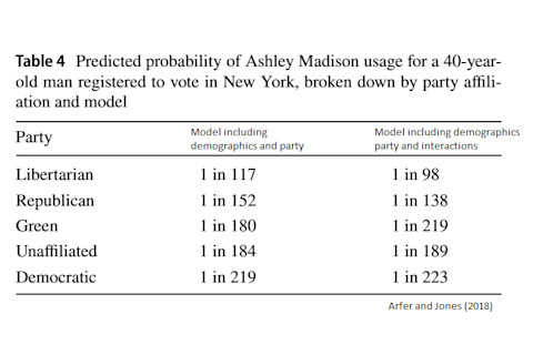 A paper just published reports that Republicans are more likely to have used the adultery website Ashley Madison than Democrats, while Libertarians were even more likely to do so. That's a claim that could ruffle some feathers, but the way in which the researchers conducted this study might be even more controversial. That's because this paper is based on the 2015 Ashley Madison data leak, which exposed the personal data, including names and credit-card details, of millions of registered users. For this study, the authors, Kodi B. Arfer and Jason J. Jones, took the leaked data and matched it up against voter registration records for five U.S. states. They considered a voter to be an active Ashley Madison user if they had ever paid money to the website. About 1 in 500 voters met these criteria. Those voters registered as Libertarians were most likely to be active users, even controlling for age, gender and state. Registered Republicans came next and Democrats were least likely.