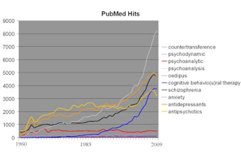 The works of Sigmund Freud were enormously influential in 20th century psychiatry, but they've now been reduced to little more than a fringe belief system. Armed with the latest version of my PubMed history script, and inspired by this classic gnxp post on the death of Marxism, postmodernism, and other stupid academic fads I decided to see how this happened.