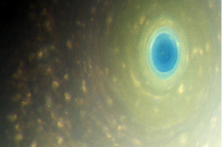 That striking, sky-blue feature is the eye of a persistent hurricane at Saturn's north pole. The feature is 1,200 miles across, about 20 times larger than the average hurricane eye on Earth. And clouds are swirling around it as fast as 330 miles per hour.