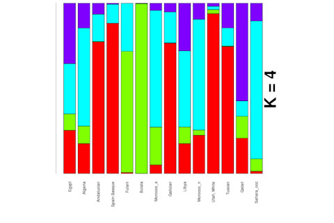 So what can we see here? First, let's reiterate something: as in the case of the populations of the Horn of Africa the West Eurasian element in the Fulani is difficult to find in "pure" form in the populations from which it putatively derived. What does that imply? I think that that means that the Fulani have an origin in relatively recent historic time, on the order of 2,000, not 10,000, years. That is because I am skeptical that the Fulani would be able to maintain genetic distinctiveness for ~10,000 years from other populations around them. In contrast, the last 2,000 years have seen the rise of various cultural institutions, from trans-Saharan nomadism to Islam, which might slow down admixture sufficiently to maintain the differences between the Fulani and their neighbors. It also implies to me that the non-Maghrebi "Near Eastern" element which Henn et al. discerned is relatively a recent phenomenon in northwest Africa, else the Fulani should also carry it. How recent? Probably from Classical Antiquity down to the Muslim period. Observe that many North Africa groups have a red "European" element. This may be from Near Eastern populations, but I suspect that the fraction here is just too high to be explained by that. Also, you can see above that some groups in Morocco have nearly as much of this as Egyptians, but far less of the more genuine Near Eastern components.