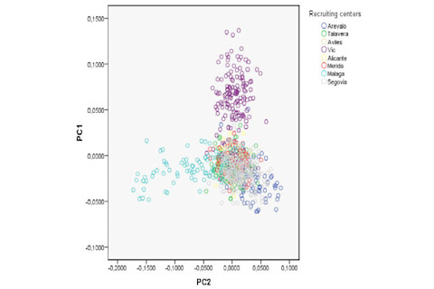 They used a 160 K SNP-chip for this, though for the PC charts below they were constrained to ~100,000 SNPs. Nothing too revolutionary in the paper. The fact that Spaniards have more haplotype diversity vis-a-vis the "CEU" sample in the HapMap, which consists of Utah Mormons, isn't too surprising, since those individuals are Northern European and Northern Europeans tend to be a touch less diverse than Southern Europeans (more heterozygosity in Southern Europe than in the North). A common explanation for this is that Northern European populations emerged as subsets of Southern populations which expanded out of Ice Age "refugia" within the last ~10,000 years or so, and this migratory process would have induced some bottlenecks and so reduced their diversity. The findings in this paper are broadly consistent with the idea that Spain was a refugium, and so one of the sources of the population of Northern Europe. But, note that there are lots of controversies about recent European demographic history right now, so I wouldn't take the aforementioned model as a given. Also, one major issue which sticks out is the lack of Basque populations in the sample, since that's a group which has long been of interest, and some aspects of many demographic scenarios hinge on their nature. No surprise that Visigoths, Berbers and Arabs didn't perturb these results too much. I believe that these groups did arrive in Iberia in large numbers, but on a relative scale their proportions were small and they probably didn't alter Spain's basically genetic character. Below are some charts of note. First, dimensions of genetic variation in the Spanish population using 100,000 SNPs by locality where the sample was collected.